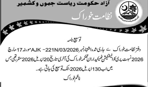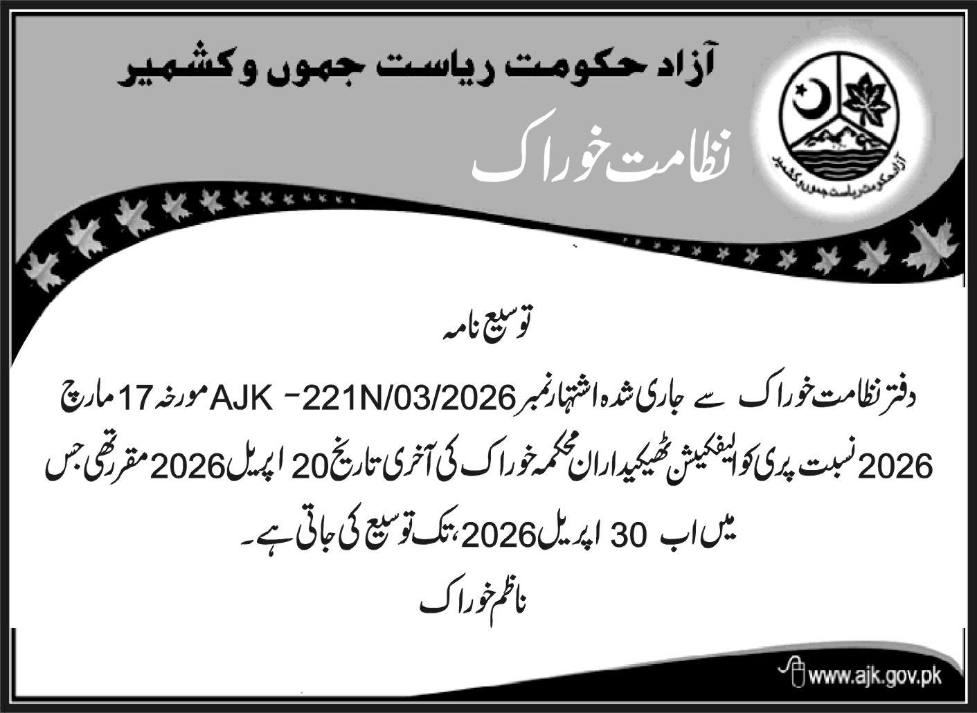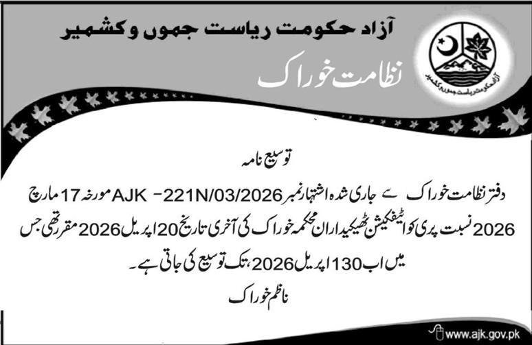 پری کوالیفیکیشن ٹھیکیداران محکمہ خوراک نے محکمے کی طرف سے جاری تاریخمیںتبدیلی کر تے ہوئے نئی تاریخ کا اشتہار جاری کردیا فیس بک ٹویٹر واٹس ایپ ای میل 109 0 تبصرے Syed Amir اپریل 26, 2026April 26, 2026 اس خبر پر اپنی رائے کا اظہار کریں سخت نا پسند 0 Votes بہتر ہو سکتی تھی 0 Votes ٹھیک ہے 0 Votes اچھی ہے 0 Votes بہت اچھی ہے 0 Votes مزید پڑھیں پری کوالیفیکیشن ٹھیکیداران محکمہ خوراک نے محکمے کی طرف سے جاری تاریخمیںتبدیلی کر تے… ایجوکیشن انجنیئرنگ سیل اور ای اینڈ ایس گورنمنٹآزادجموںوکشمیر نے آزادکشمیر میںسرکاری سکولوںکی اپ گریڈیشن… ایگزیکٹیو انجینئر پی ڈیلیو ڈی ہائی ویز ڈویژن راولاکوٹ آزاد جموں و کشمیر نے… ڈائریکٹر جنرل پاپولیشن ویلفیئر ڈیپارٹمنٹگورنمنٹآف آزادجموں کشمیر نے مالی سال26-2025 کے لیے دوائیوں کی… آزادحکومت ریاست جموںوکشمیر نظامت خوراک نے پری کوالیفیکیشن رجسٹریشن ٹھیکیدارا ن ڈھلائی غلہ برائے…