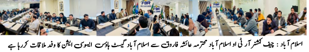 اسلام آباد: چیف کمشنر ریجنل ٹیکس آفس (آر ٹی او) اسلام آباد کی ہدایات کی روشنی میں آر ٹی او اسلام آباد نے اسلام آباد گیسٹ ہاؤسز ایسوسی ایشن کے نمائندگان کے ساتھ ایک اہم اجلاس منعقد کیا۔اجلاس کی صدارت چیف کمشنر آر ٹی او اسلام آباد محترمہ عائشہ فاروق نے کی، جبکہ کمشنر آئی سی ٹی او زون محترمہ عظمیٰ منیر، ایڈیشنل کمشنر آئی سی ٹی او زون جمال خان جسرا اور اسسٹنٹ کمشنر یونٹ ون آئی سی ٹی او زون محترمہ فاطمہ طارق بھی اجلاس میں شریک تھیں۔