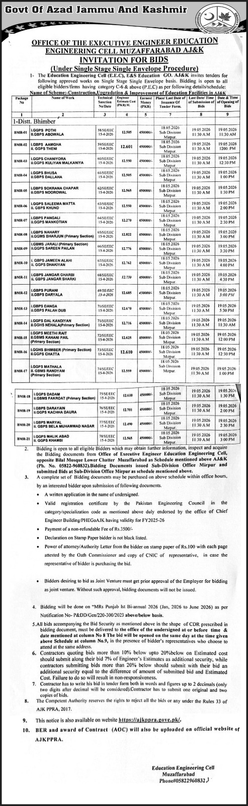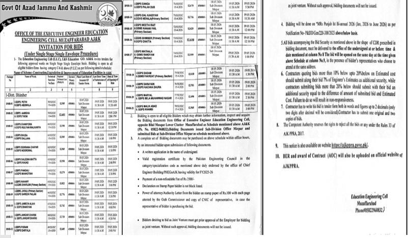 ایجوکیشن انجنیئرنگ سیل اور ای اینڈ ایس گورنمنٹآزادجموںوکشمیر نے آزادکشمیر میںسرکاری سکولوںکی اپ گریڈیشن اور دیگر سہولیات کی فراہمی کے لیے کمپنیوں سے بولی لینے کے لیے اشتہار جاری کردیا فیس بک ٹویٹر واٹس ایپ ای میل 114 0 تبصرے Syed Amir اپریل 24, 2026April 25, 2026 اس خبر پر اپنی رائے کا اظہار کریں سخت نا پسند 0 Votes بہتر ہو سکتی تھی 0 Votes ٹھیک ہے 0 Votes اچھی ہے 0 Votes بہت اچھی ہے 0 Votes مزید پڑھیں پری کوالیفیکیشن ٹھیکیداران محکمہ خوراک نے محکمے کی طرف سے جاری تاریخمیںتبدیلی کر تے… ایجوکیشن انجنیئرنگ سیل اور ای اینڈ ایس گورنمنٹآزادجموںوکشمیر نے آزادکشمیر میںسرکاری سکولوںکی اپ گریڈیشن… ایگزیکٹیو انجینئر پی ڈیلیو ڈی ہائی ویز ڈویژن راولاکوٹ آزاد جموں و کشمیر نے… ڈائریکٹر جنرل پاپولیشن ویلفیئر ڈیپارٹمنٹگورنمنٹآف آزادجموں کشمیر نے مالی سال26-2025 کے لیے دوائیوں کی… آزادحکومت ریاست جموںوکشمیر نظامت خوراک نے پری کوالیفیکیشن رجسٹریشن ٹھیکیدارا ن ڈھلائی غلہ برائے…