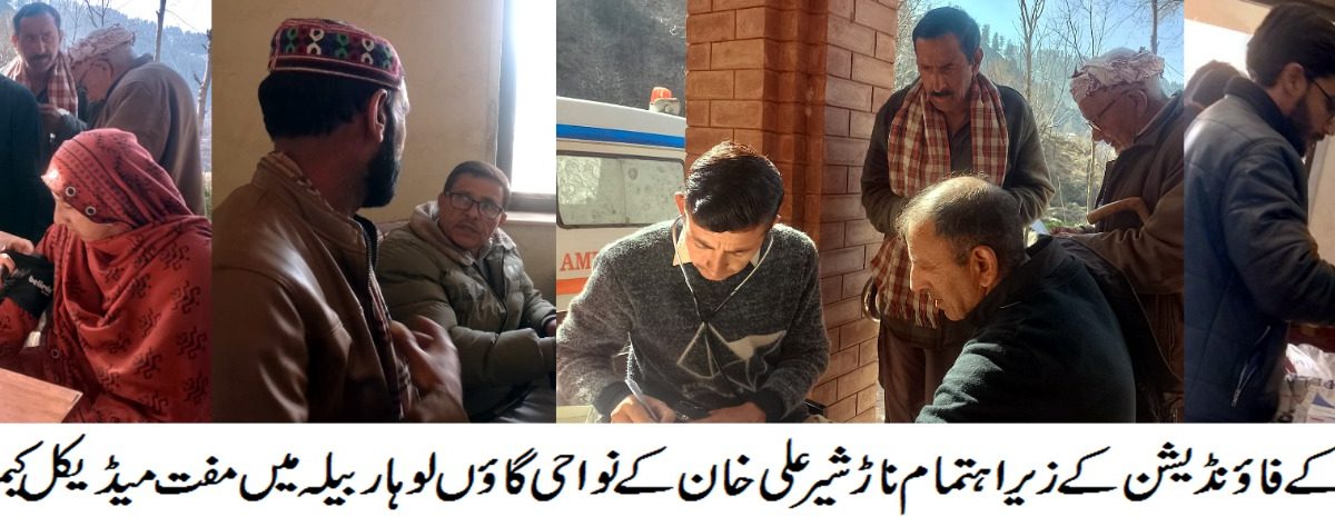 باغ+مظفرآباد(سٹیٹ ویوز)آزادکشمیر کے ضلع باغ تحصیل ریڑہ یونین کونسل ناڑ شیر علی خان کے نواحی علاقے بی ایچ یو لوہار بیلہ میں رفاہی تنظیم “خدیجہ زرین خان فاؤنڈیشن” کے زیر اہتمام کمیونٹی ویلفیئر آرگنایزیشن اسلام آباد کے تعاون سے ایک روزہ فری میڈیکل کمیپ کا انعقاد، مریضوں کی کتیر تعداد نے فری میڈیکل کمیپ میں مختلف بیماریوں کا معاینہ ماہر ڈاکٹروں سے کروایا اور مفت ادویات بھی حاصل کیں، مفت طبی کیمپ میں زیادہ تعداد بچے، بزرگ اور خواتین شامل تھی جنکو معدے، بلڈ پریشر، شوگر، الرجی، نمونیا معدے اور دانتوں کے مسائل تھے، ماہر ڈاکٹروں کی ٹیم میں گائنی،میڈیکل اسپیشلسٹ، ودیگر ماہرین شامل تھے .