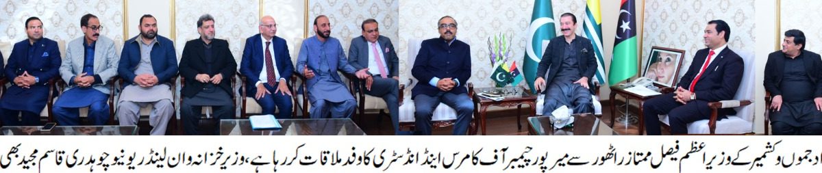 ملاقات کے دوران میرپور اور آزاد جموں و کشمیر میں صنعتی و تجارتی سرگرمیوں، سرمایہ کاری کے فروغ، روزگار کے مواقع اور کاروباری برادری کو درپیش مسائل پر تفصیلی تبادلہ خیال کیا گیا۔ وفد نے وزیراعظم کو میرپور چیمبر آف کامرس کی سرگرمیوں اور صنعتکاروں کو لاحق مشکلات سے آگاہ کیا۔اس موقع پر گفتگو کرتے ہوئے وزیراعظم فیصل ممتاز راٹھور نے کہا کہ حکومت آزاد جموں و کشمیر میں صنعت و تجارت کے فروغ کے لیے جامع حکمت عملی پر عمل پیرا ہے۔ انہوں نے کہا کہ سرمایہ کاروں اور کاروباری برادری کو سازگار ماحول فراہم کرنا حکومت کی اولین ترجیح ہے تاکہ معیشت مستحکم ہو اور نوجوانوں کے لیے روزگار کے نئے مواقع پیدا ہوں۔
