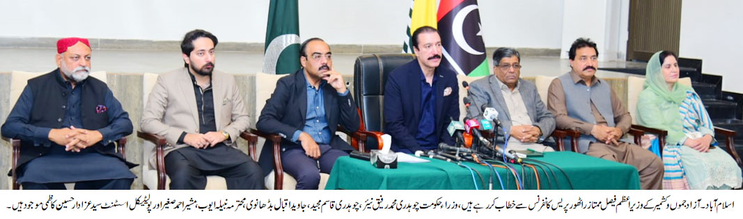آزادکشمیر کی سلامتی پاکستان کے ساتھ جڑی ہے، کوئی بھی ہماری پاک فوج کا بال بھی بیکا نہیں کر سکتا،میں بیس کیمپ کی حکومت کے سربراہ کے طور پر اپنی پاک فوج کو کشمیری قوم کی مکمل حمایت کا یقین دلاتا ہوں۔ کشمیریوں کو حق خود ارادیت مل کر رہیگا۔ وزیراعظم نے ان خیالات کا اظہار جموں کشمیر ہاؤس اسلام آباد میں پرہجوم پریس کانفرنس سے خطاب کرتے ہوے کیا۔اس موقع پر وزیراطلاعات،اوقاف و مذہبی امور چوہدری محمد رفیق نیئر،وزیر خرانہ چوہدری قاسم مجید،وزیر خوراک جاوید اقبال بڈھانوی،وزیر برائے کشمیر کاز وماحولیات محترمہ نبیلہ ایوب، مشیرحکومت احمد صفیر اور پولیٹیکل اسسٹنٹ سید عزادار حسین کاظمی بھی موجود تھے۔