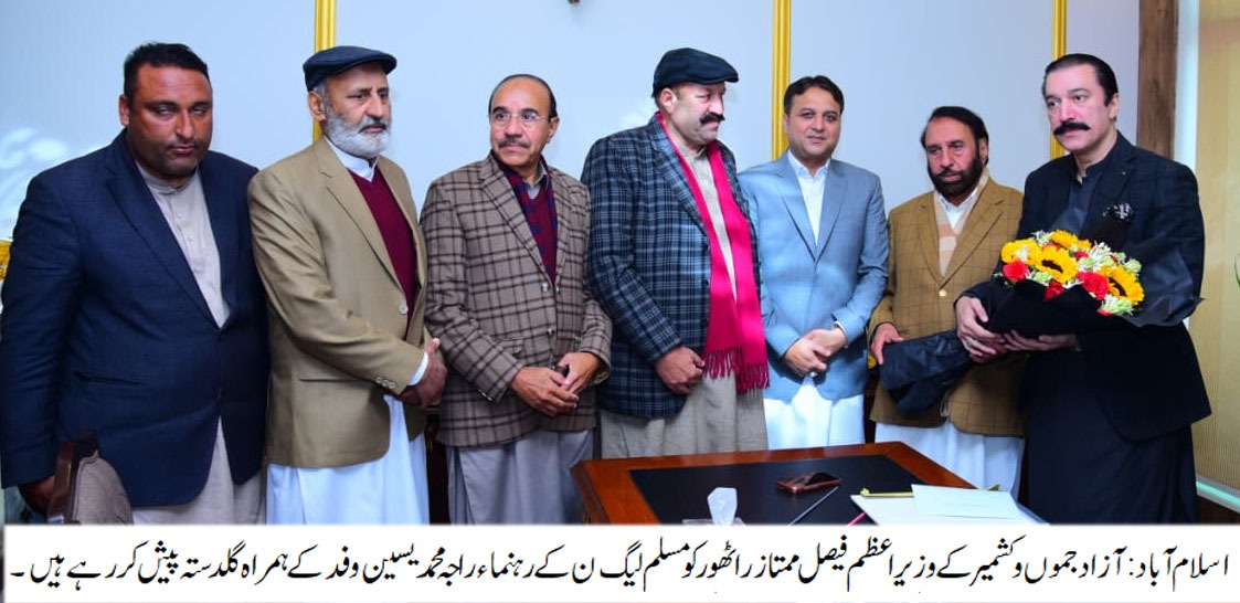 وفد نے وزیراعظم فیصل ممتاز راٹھور کو وزارت عظمیٰ کا منصب سنبھالنے پر مبارکباد دی، گلدستہ پیش کیا اور ان کے لیے نیک تمناؤں کا اظہار کیا۔ ملاقات کے دوران آزاد جموں و کشمیر کی مجموعی سیاسی صورتحال، عوامی مسائل، ترقیاتی امور اور خطے کو درپیش چیلنجز پر تفصیلی تبادلہ خیال کیا گیا۔