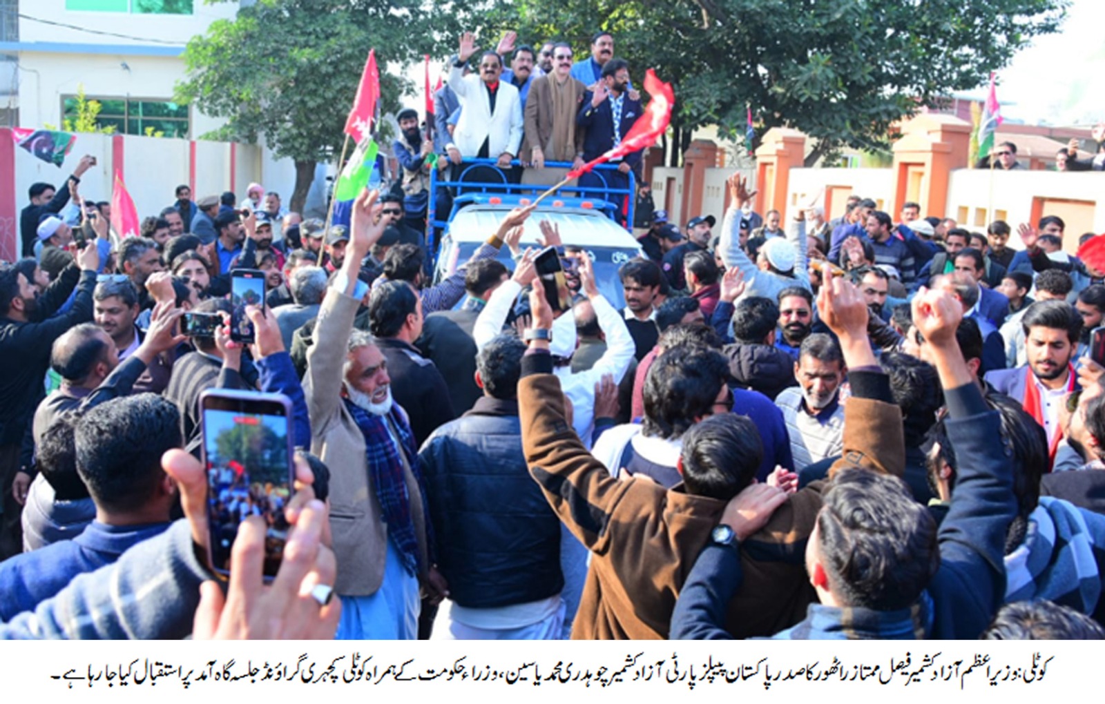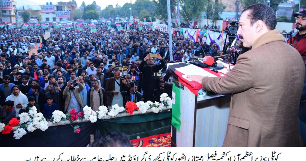 ان خیالات کا اظہار وزیراعظم آزاد کشمیر راجہ فیصل ممتاز راٹھور نے کوٹلی کچہری گراؤنڈ میں پاکستان پیپلزپارٹی آزاد کشمیر کے زیر اہتمام منعقدہ عظیم الشان عوامی جلسہ عام سے خطاب کرتے ہوئے کیا۔ جلسے میں سیاسی، سماجی، بلدیاتی نمائندگان، وکلا، صحافیوں اور پارٹی کارکنان کی بڑی تعداد نے شرکت کی۔ جلسہ عوامی طاقت، نظریاتی وابستگی اور پارٹی اتحاد کا بھرپور مظاہرہ تھا۔
