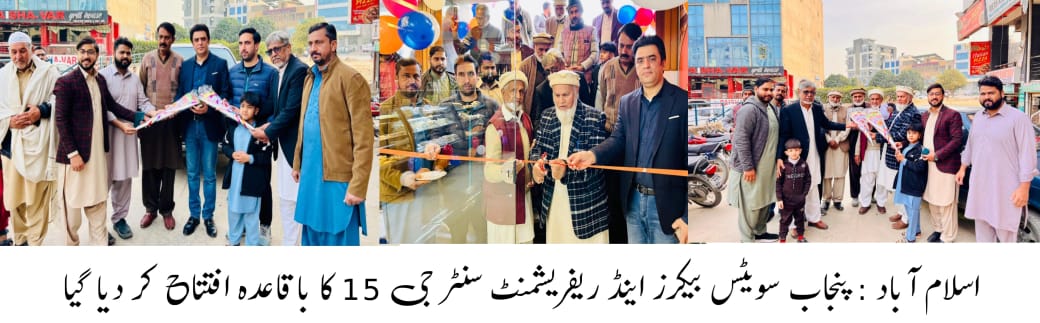 اسلام آباد :پنجاب سویٹس بیکرز اینڈ ریفریشمنٹ سنٹر جی 15 کا باقاعدہ افتتاح کر دیا گیا۔ افتتاحی تقریب کے مہمانِ خصوصی وائس چیئرمین ضلع کونسل جہلم ویلی و جنرل سیکرٹری جی 15 چوہدری زاہد فرید اور سید اطہر شاہ بخاری تھے جنہوں نے ربن کاٹ کر بیکری کا افتتاح کیا۔