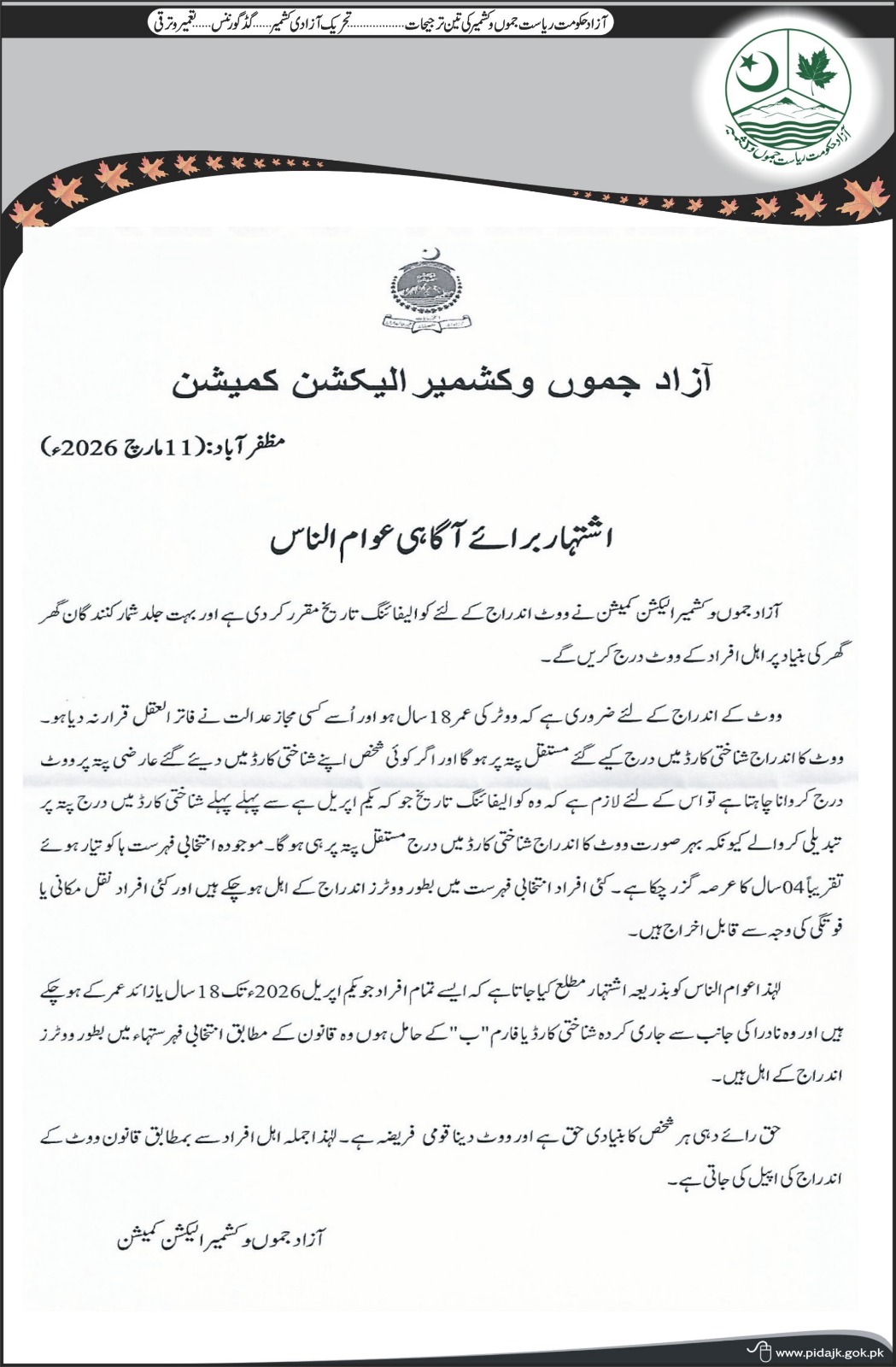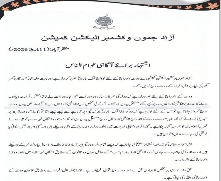 آزادجموں وکشمیر الیکشن کمیشن نے ووٹکے اندراج کے لیے کوالیفائنگ تاریخمقرر کردی فیس بک ٹویٹر واٹس ایپ ای میل 189 0 تبصرے Syed Amir مارچ 12, 2026March 27, 2026 اس خبر پر اپنی رائے کا اظہار کریں سخت نا پسند 0 Votes بہتر ہو سکتی تھی 0 Votes ٹھیک ہے 0 Votes اچھی ہے 0 Votes بہت اچھی ہے 0 Votes مزید پڑھیں ڈائریکٹر جنرل پاپولیشن ویلفیئر ڈیپارٹمنٹگورنمنٹآف آزادجموں کشمیر نے مالی سال26-2025 کے لیے دوائیوں کی… آزادحکومت ریاست جموںوکشمیر نظامت خوراک نے پری کوالیفیکیشن رجسٹریشن ٹھیکیدارا ن ڈھلائی غلہ برائے… آزادجموں وکشمیر الیکشن کمیشن نے ووٹکے اندراج کے لیے کوالیفائنگ تاریخمقرر کردی آزادحکومت ریاست جموںوکشمیرسیکرٹریٹ فزیکل پلاننگ اور ہاؤسنگ نے اپنے ادارے کے لیے چیئرمین کی… 5 فروری یوم یکجہتی کشمیرکادن حکومت پاکستان اور اہلیان پاکستان کی طرف سے سرکاری…