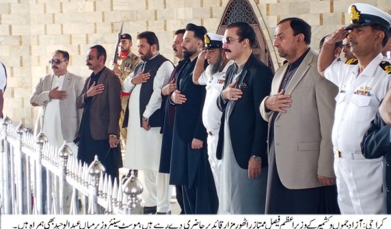 آزاد جموں و کشمیر کے وزیراعظم فیصل ممتاز راٹھور نے بانیٔ پاکستان حضرت قائداعظم محمد علی جناحؒ کے مزار پر حاضری دی اورپھولوں کی چادر چڑھائی