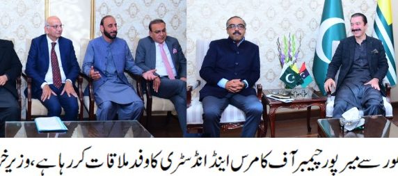 جموں کشمیر ہاؤس میں میرپور چیمبر آف کامرس اینڈ انڈسٹری کے وفد کی صدر عمر شہزاد جرال کی قیادت میں وزیر اعظم آزادکشمیر سے ملاقات